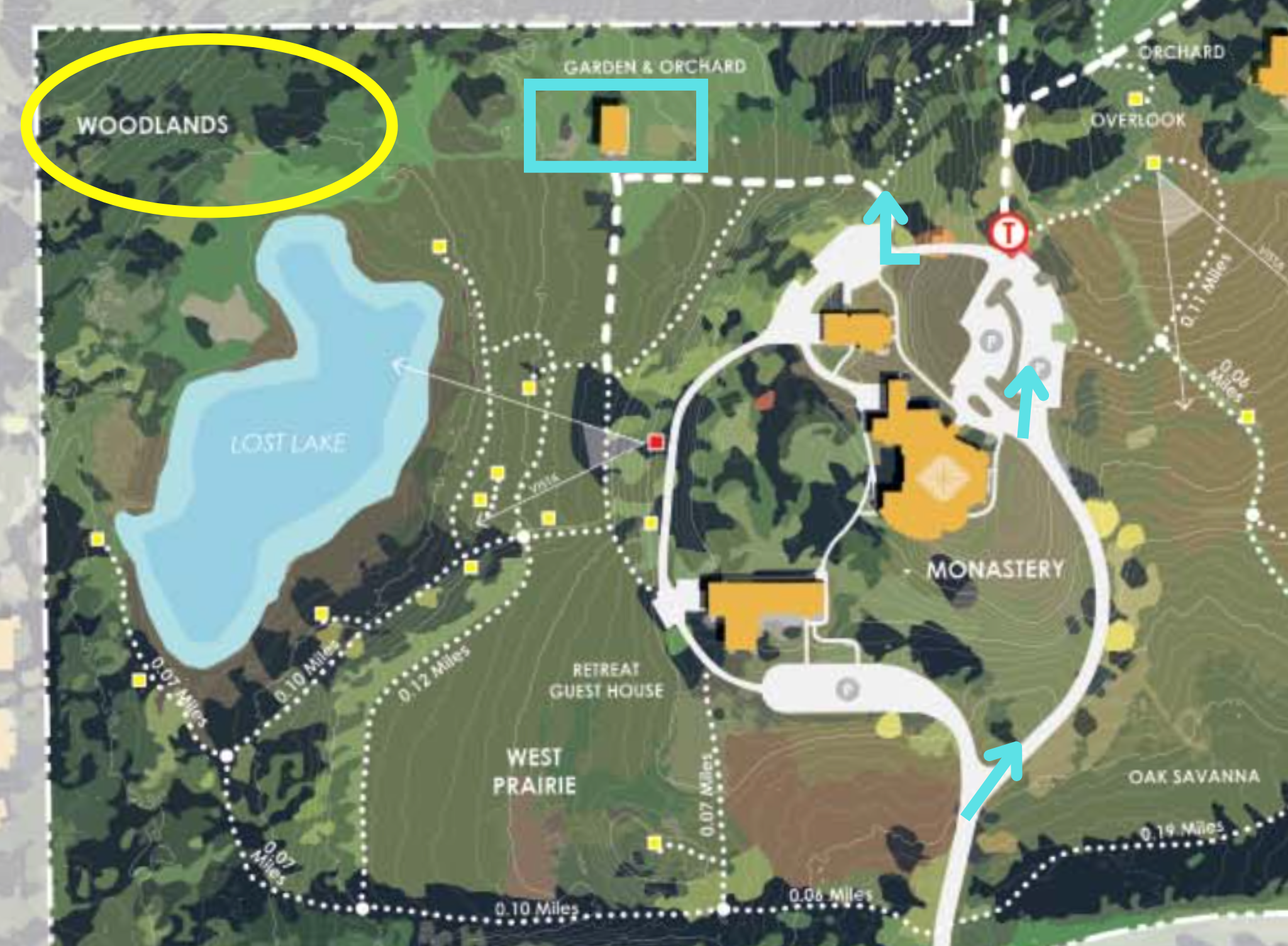Upon entering the monastery driveway, keep right and go through the top parking lot. Take a right into a hidden driveway before a new section of parking spaces. Signs will be up directing where to park.